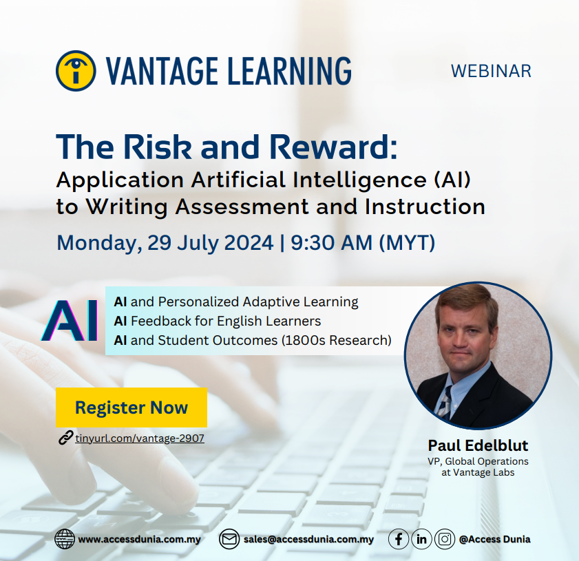 Sukacita dimaklumkan bahawa pihak Access Dunia dengan kerjasama Vantage Learning akan menganjurkan Webinar bertajuk The Risk and Reward: Application of Artificial Intelligence to Writing Assessment and Instruction pada ketetapan berikut: