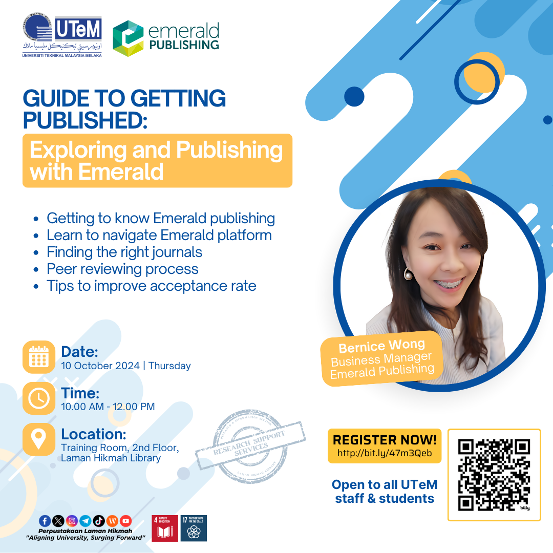 Sukacita dimaklumkan bahawa pihak Perpustakaan Laman Hikmah (PLH) dengan kerjasama EMERALD PUBLISHING akan menganjurkan "GUIDE TO GETTING PUBLISHED: EXPLORING AND PUBLISHING WITH EMERALD" seperti ketetapan berikut:
