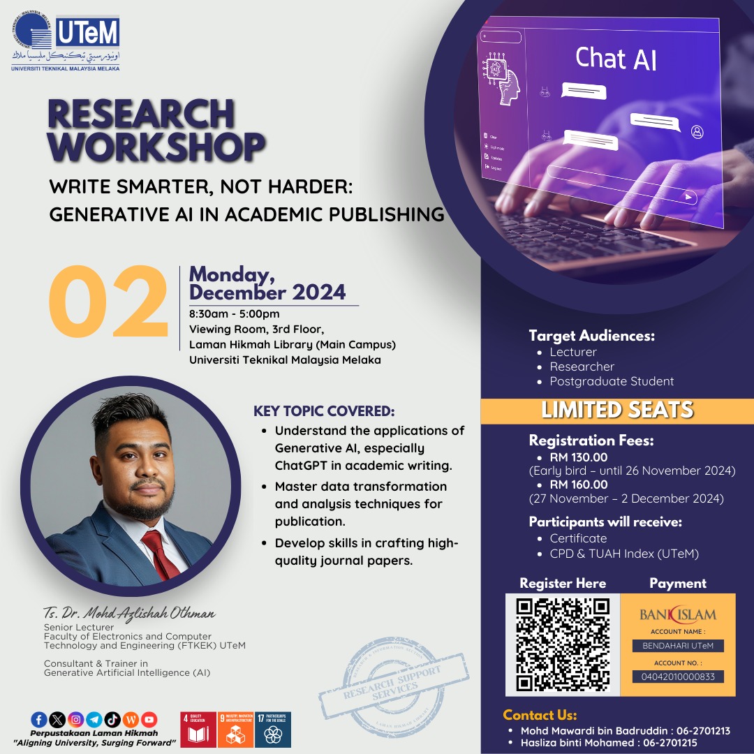 Sukacita dimaklumkan bahawa Perpustakaan Laman Hikmah (PLH), UTeM akan menganjurkan ‘Bengkel Penyelidikan bertajuk Write Smarter, Not Harder: Generative AI In Academic Publishing’. Bengkel ini merupakan kesinambungan daripada webinar Penulisan Jurnal: Kuasai AI Untuk Penulisan Ilmiah Anda yang diadakan pada 21 Mac 2024 dan telah mendapat maklumbalas yang amat menggalakkan. Rakaman bagi webinar tersebut boleh diakses di sini. Pihak PLH menjemput YBhg. Datuk/Prof./Prof. Madya/Dr./Tuan/Puan untuk menyertai bengkel ini pada ketetapan berikut: