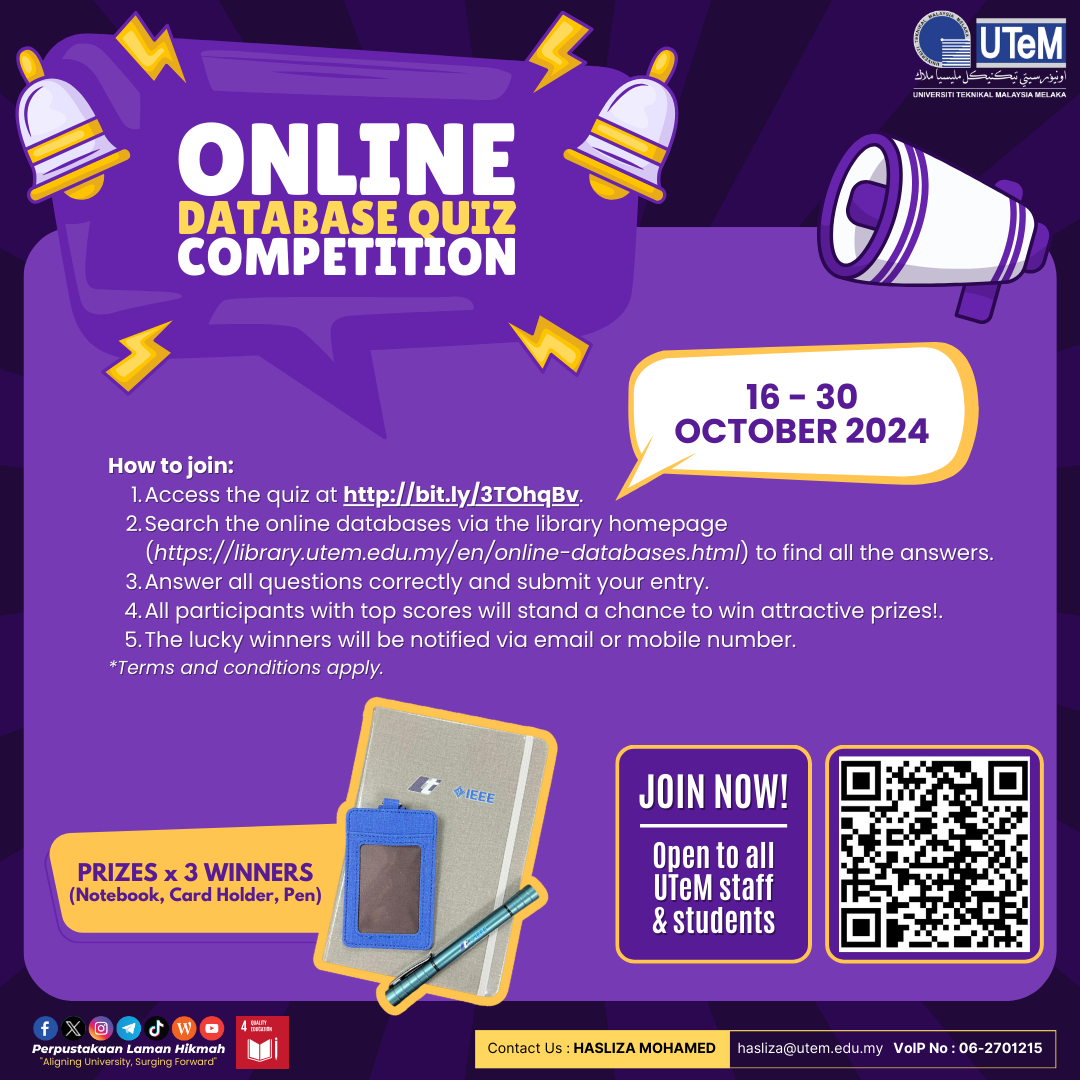 Sukacita dimaklumkan bahawa pihak Perpustakaan Laman Hikmah (PLH) sedang menganjurkan 'Online Database Quiz Competition'. Aktiviti ini merupakan inisiatif untuk meningkatkan penggunaan pangkalan data langganan PLH.