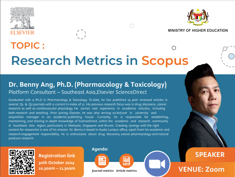 Sukacita dimaklumkan bahawa pihak Elsevier akan menganjurkan Scopus Webinar Series bertajuk Research Metrics in Scopus seperti ketetapan berikut: