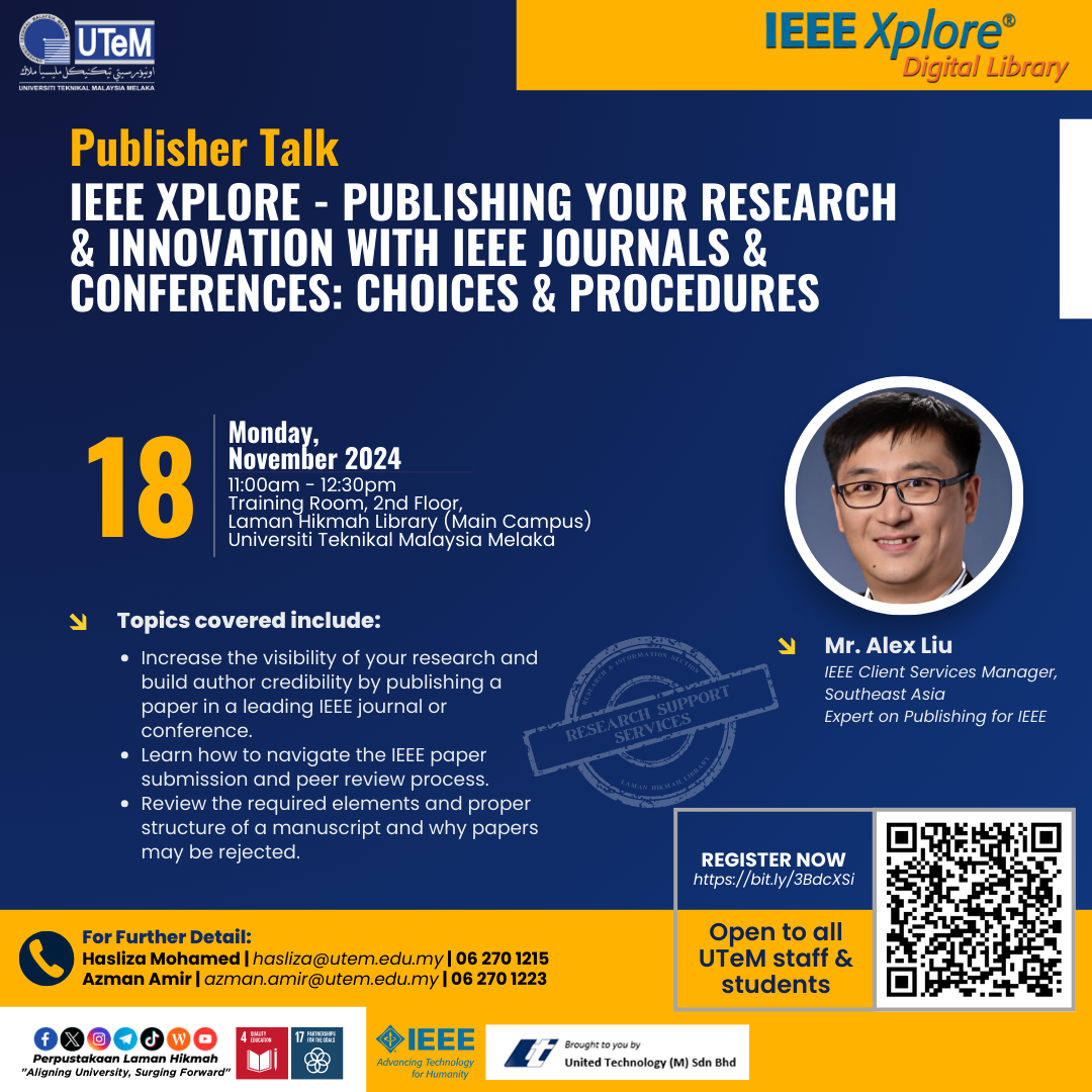 Sukacita dimaklumkan bahawa Perpustakaan Laman Hikmah (PLH), UTeM dengan kerjasama IEEE & United Technology Sdn. Bhd. akan menganjurkan PUBLISHER TALK "IEEE EXPLORE - PUBLISHING YOUR RESEARCH & INNOVATION WITH IEEE JOURNALS & CONFERENCES: CHOICES & PROCEDURES". Pihak PLH menjemput YBhg. Datuk/Prof./Prof. Madya/Dr./Tuan/Puan bagi menghadiri sesi ini pada ketetapan yang berikut: