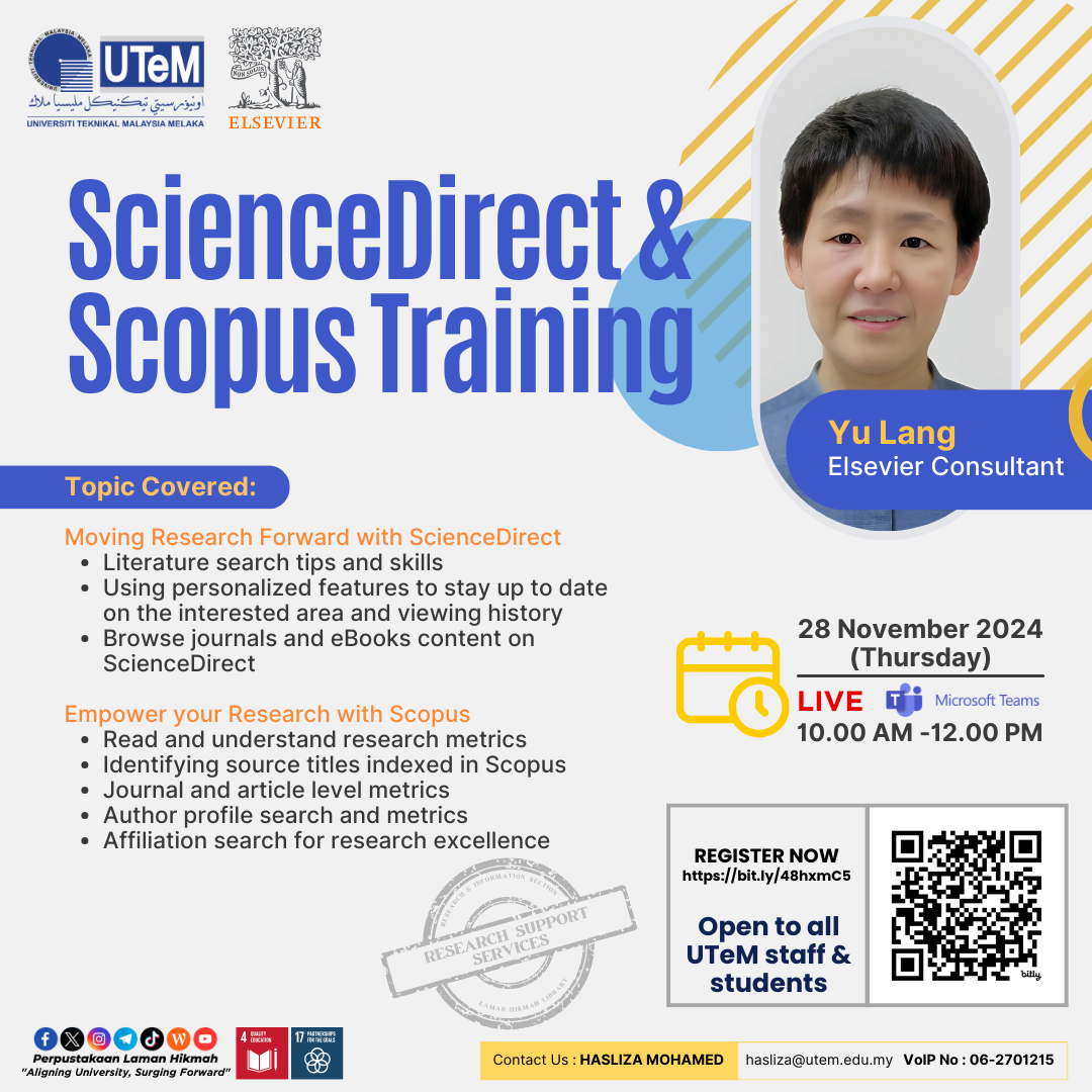 Sukacita dimaklumkan bahawa Perpustakaan Laman Hikmah (PLH), UTeM dengan kerjasama Elsevier akan menganjurkan “ScienceDirect & Scopus Training". Pihak PLH menjemput YBhg. Datuk/Prof./Prof. Madya/Dr./Tuan/Puan bagi menghadiri sesi ini pada ketetapan yang berikut: