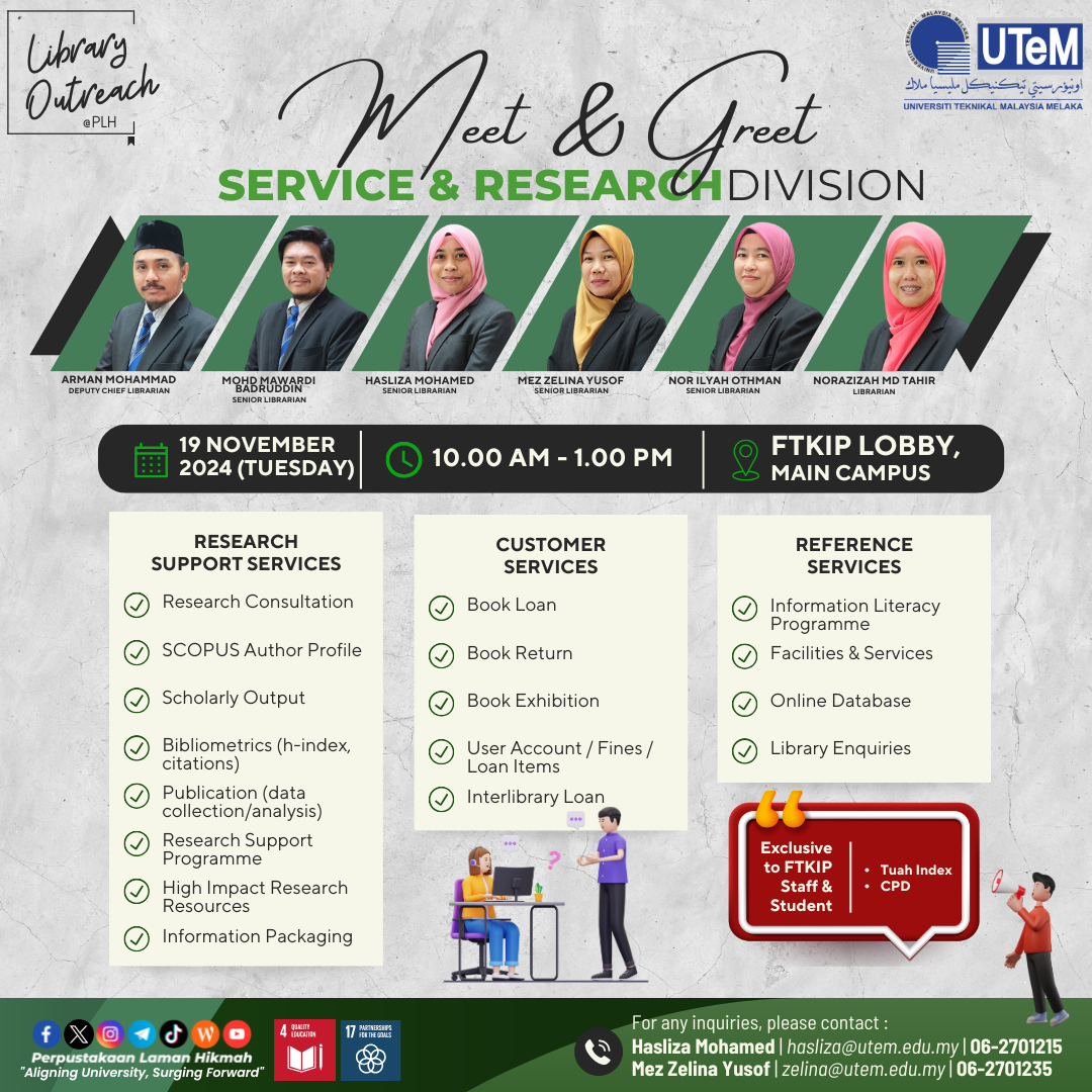 “Library Outreach: Meet & Greet Service and Research Division" eksklusif untuk warga Fakulti Teknologi Dan Kejuruteraan Industri Dan Pembuatan (FTKIP).