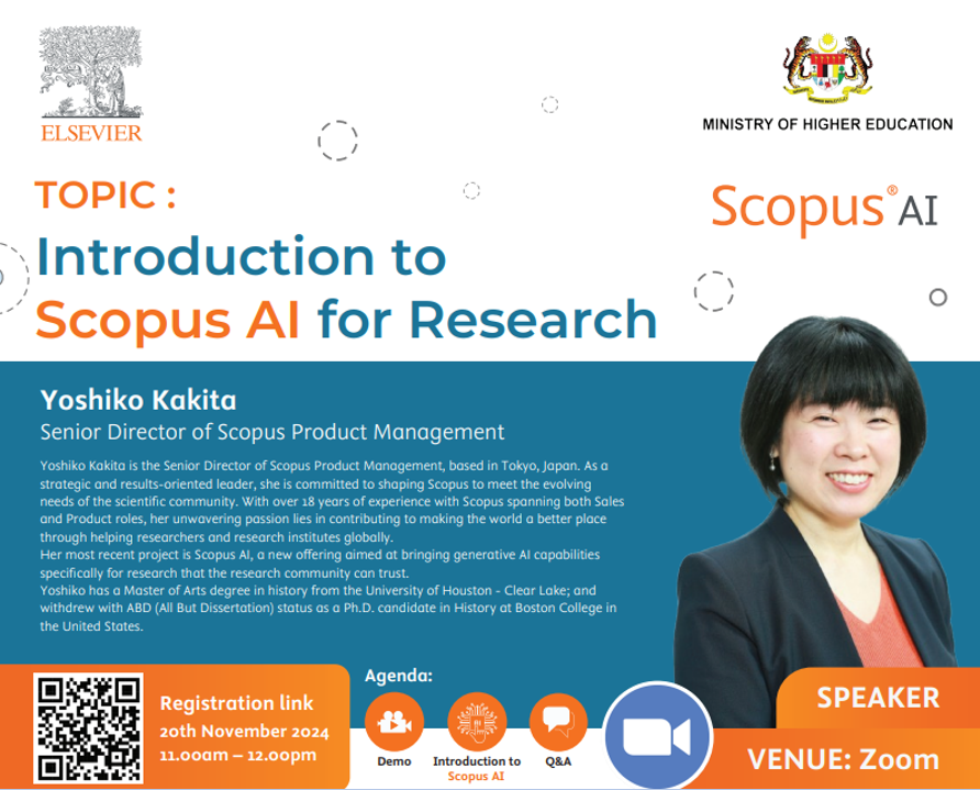 Sukacita dimaklumkan bahawa pihak Elsevier dengan kerjasama Kementerian Pendidikan Tinggi akan menganjurkan Scopus Webinar Series: Introduction to Scopus AI for Research. Pihak PLH menjemput YBhg. Datuk/Prof./Prof. Madya/Dr./Tuan/Puan bagi menghadiri sesi ini pada ketetapan yang berikut:
