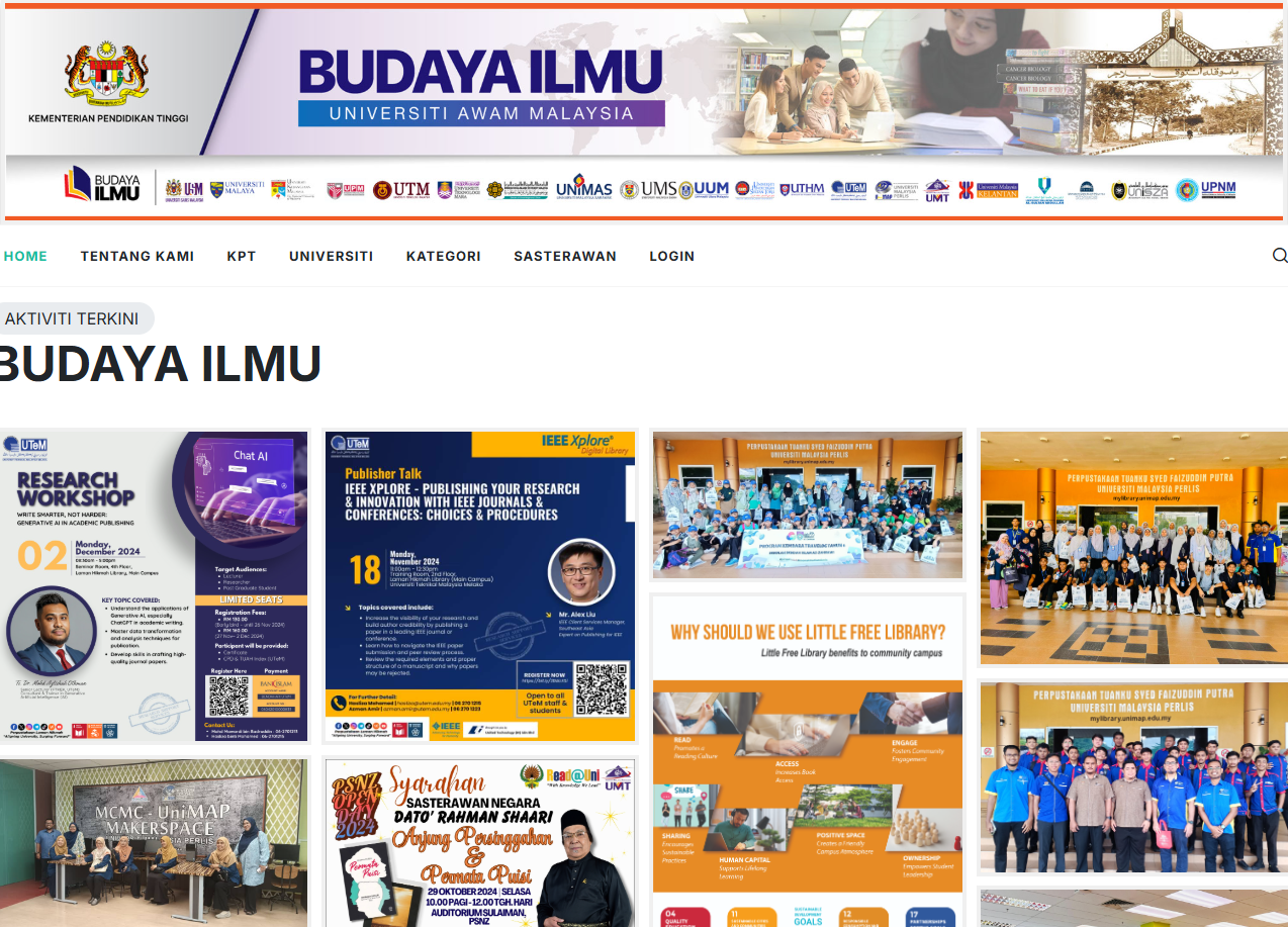 Untuk makluman, PTAR UiTM telah membangunkan Portal Budaya Ilmu Universiti Awam sebagai platform pendaftaran pelaksanaan program/ aktiviti budaya ilmu oleh semua Perpustakaan UA untuk pelaporan dan perkongsian maklumat program/ aktiviti di kalangan UA.