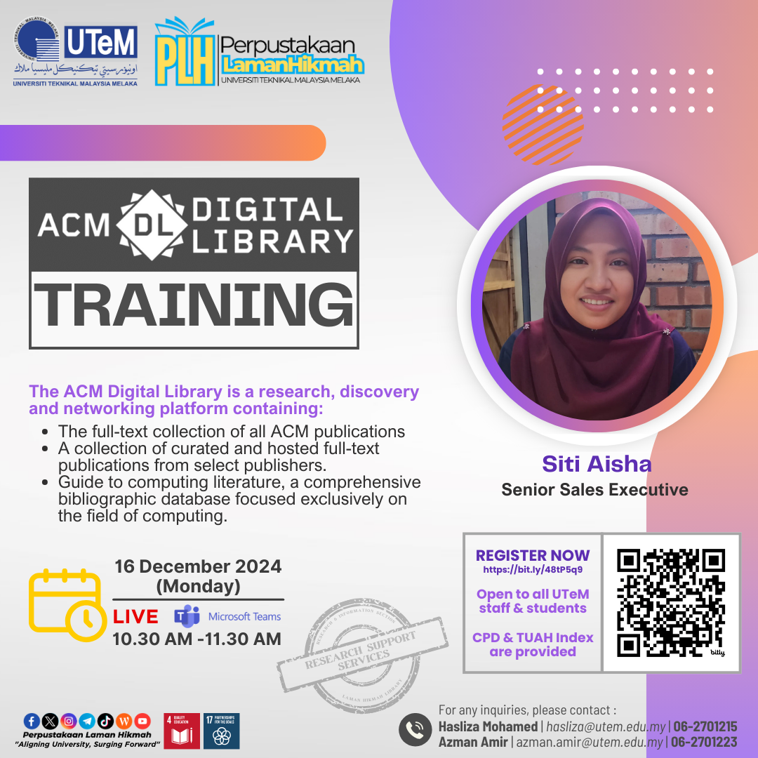 Sukacita dimaklumkan bahawa Perpustakaan Laman Hikmah (PLH), UTeM dengan kerjasama Access Dunia Sdn. Bhd. akan menganjurkan ACM Digital Library Training. Pihak PLH menjemput YBhg. Datuk/Prof./Prof. Madya/Dr./Tuan/Puan bagi menghadiri sesi ini pada ketetapan yang berikut: