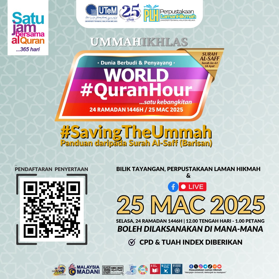 Dimaklumkan bahawa pihak Perpustakaan Laman Hikmah (PLH) akan menganjurkan program “QuranHour@PLH" bersempena World Quran Hour dan Bulan Membaca 2024.