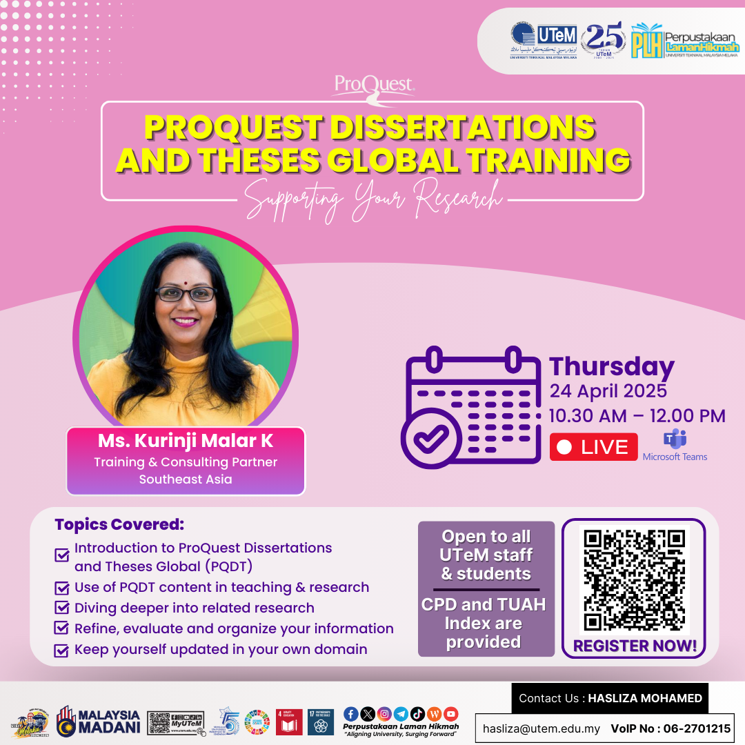 Dimaklumkan bahawa pihak ProQuest akan menganjurkan webinar bertajuk “ProQuest Dissertations and Theses Global Training" pada ketetapan berikut: