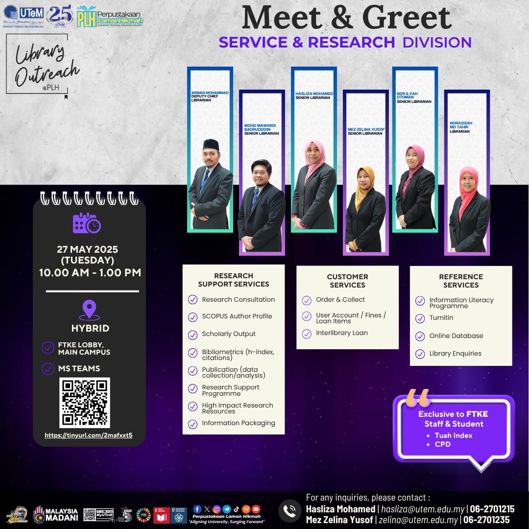 “Library Outreach: Meet & Greet Service and Research Division" eksklusif untuk warga Fakulti Teknologi Kejuruteraan Elektrik (FTKE).