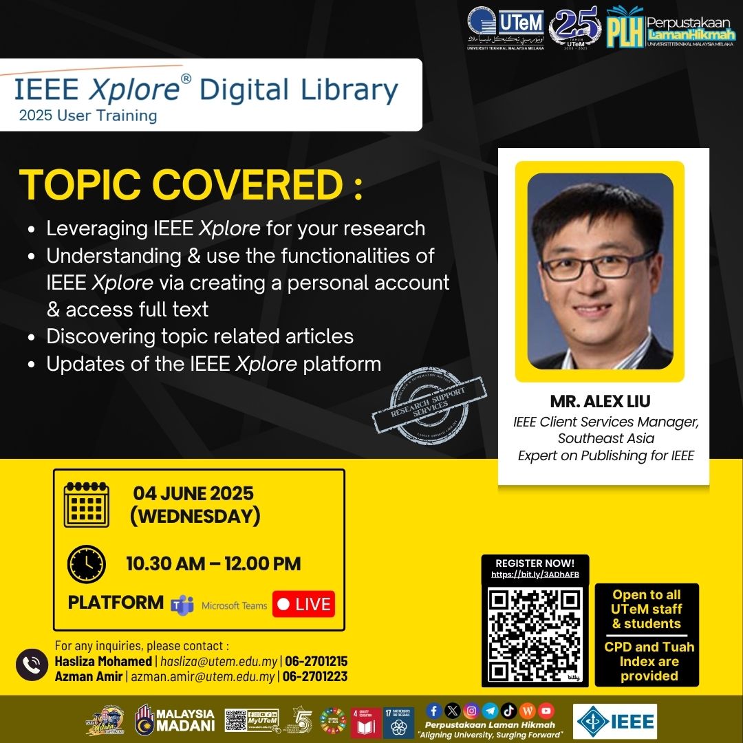 Sukacita dimaklumkan bahawa pihak Perpustakaan Laman Hikmah (PLH) akan menganjurkan IEEE Xplore Digital Library User Training.
