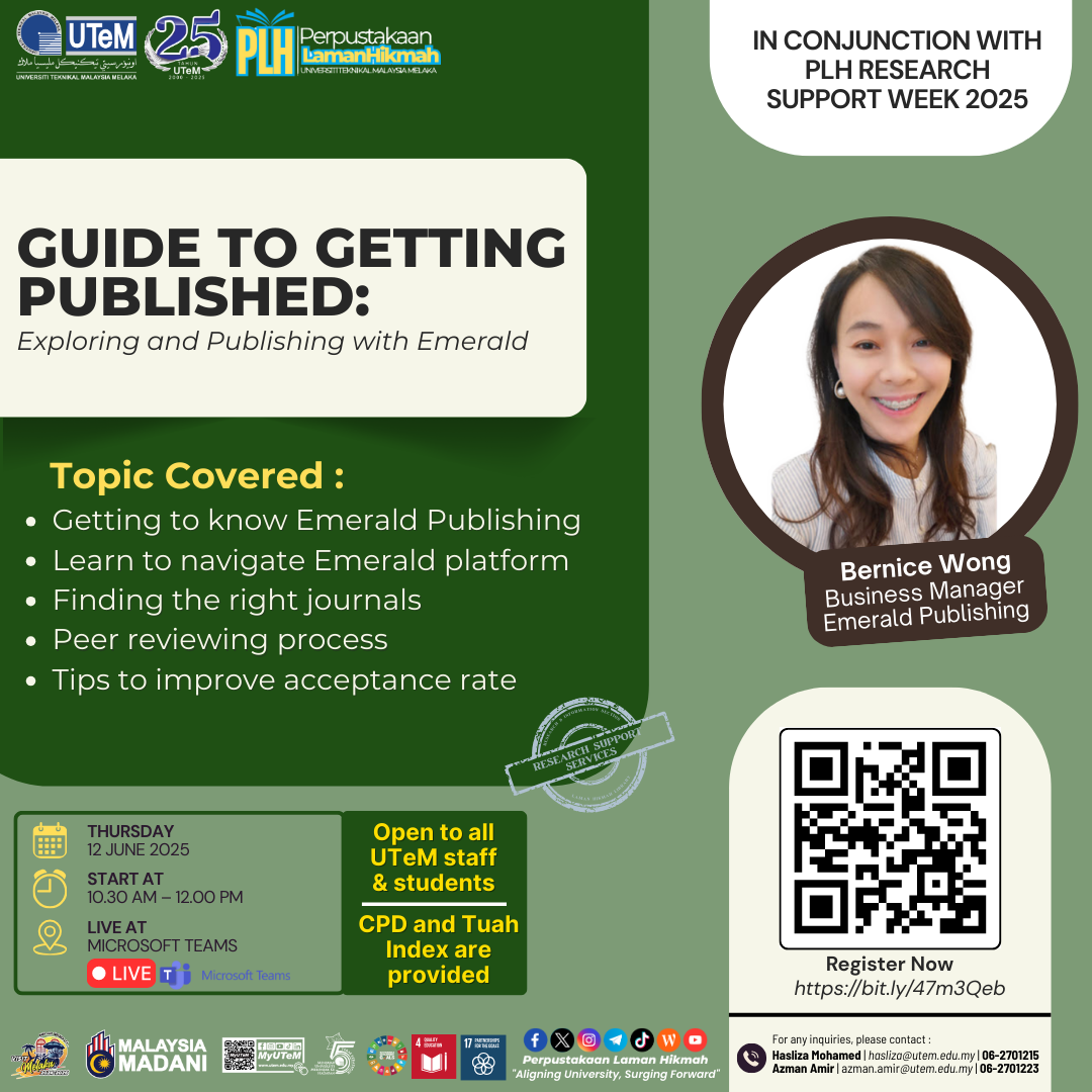 Sukacita dimaklumkan bahawa pihak Perpustakaan Laman Hikmah (PLH) dengan kerjasama EMERALD PUBLISHING akan menganjurkan "GUIDE TO GETTING PUBLISHED: EXPLORING AND PUBLISHING WITH EMERALD" seperti ketetapan berikut: