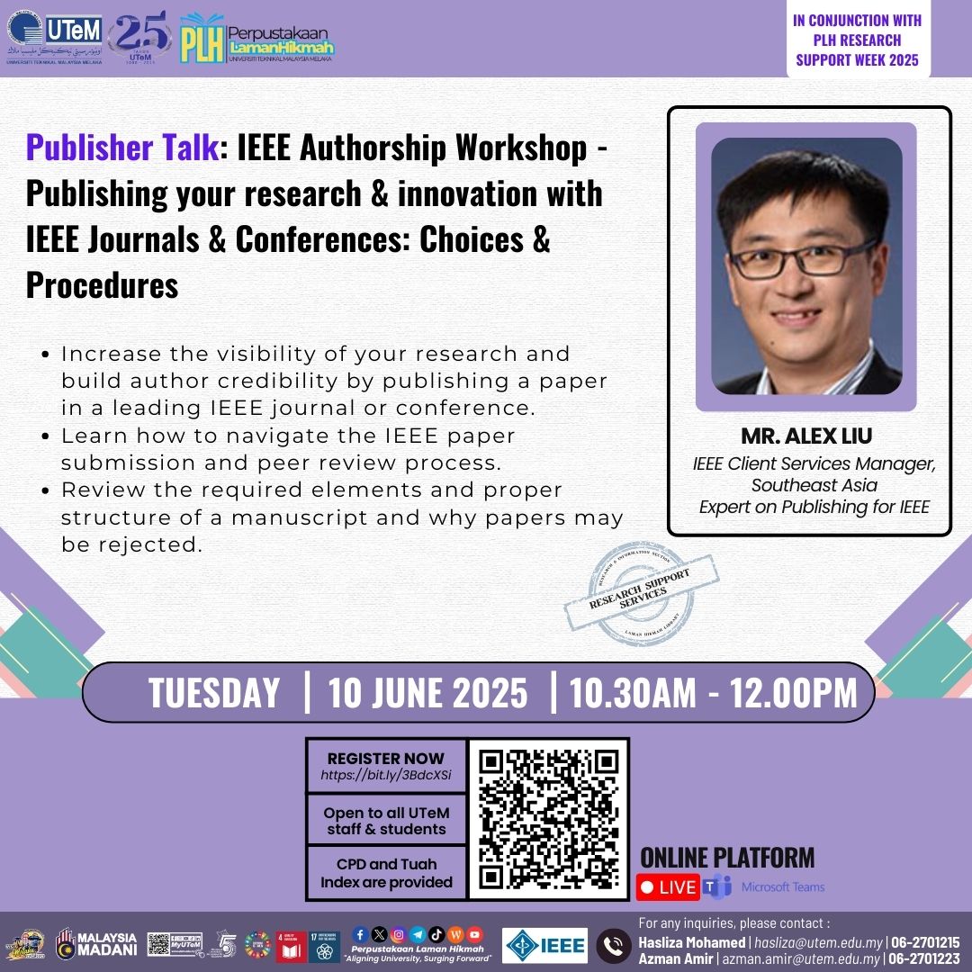 Sukacita dimaklumkan bahawa Perpustakaan Laman Hikmah (PLH), UTeM dengan kerjasama IEEE & United Technology Sdn. Bhd. akan menganjurkan PUBLISHER TALK "IEEE EXPLORE - PUBLISHING YOUR RESEARCH & INNOVATION WITH IEEE JOURNALS & CONFERENCES: CHOICES & PROCEDURES". Pihak PLH menjemput YBhg. Datuk/Prof./Prof. Madya/Dr./Tuan/Puan bagi menghadiri sesi ini pada ketetapan yang berikut: