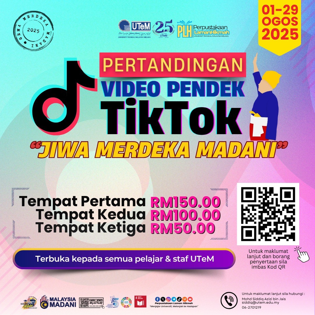 Dimaklumkan bahawa pihak Perpustakaan Laman Hikmah (PLH) akan menganjurkan Pertandingan Video Pendek TikTok sempena sambutan Bulan Kemerdekaan yang ke 68 tahun.