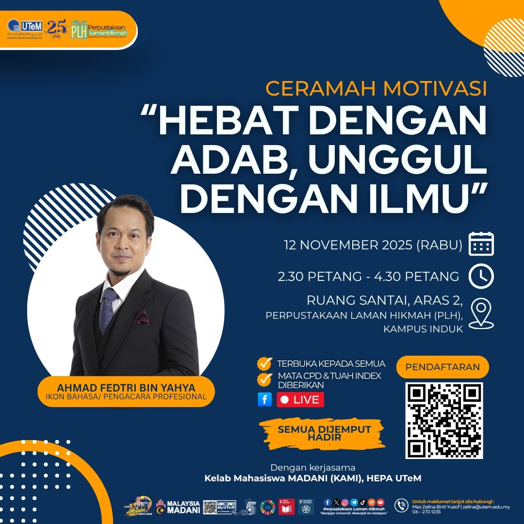 Sukacita dimaklumkan Perpustakaan Laman Hikmah (PLH) akan menganjurkan CERAMAH MOTIVASI 'HEBAT DENGAN ADAB, UNGGUL DENGAN ILMU' seperti ketetapan berikut: